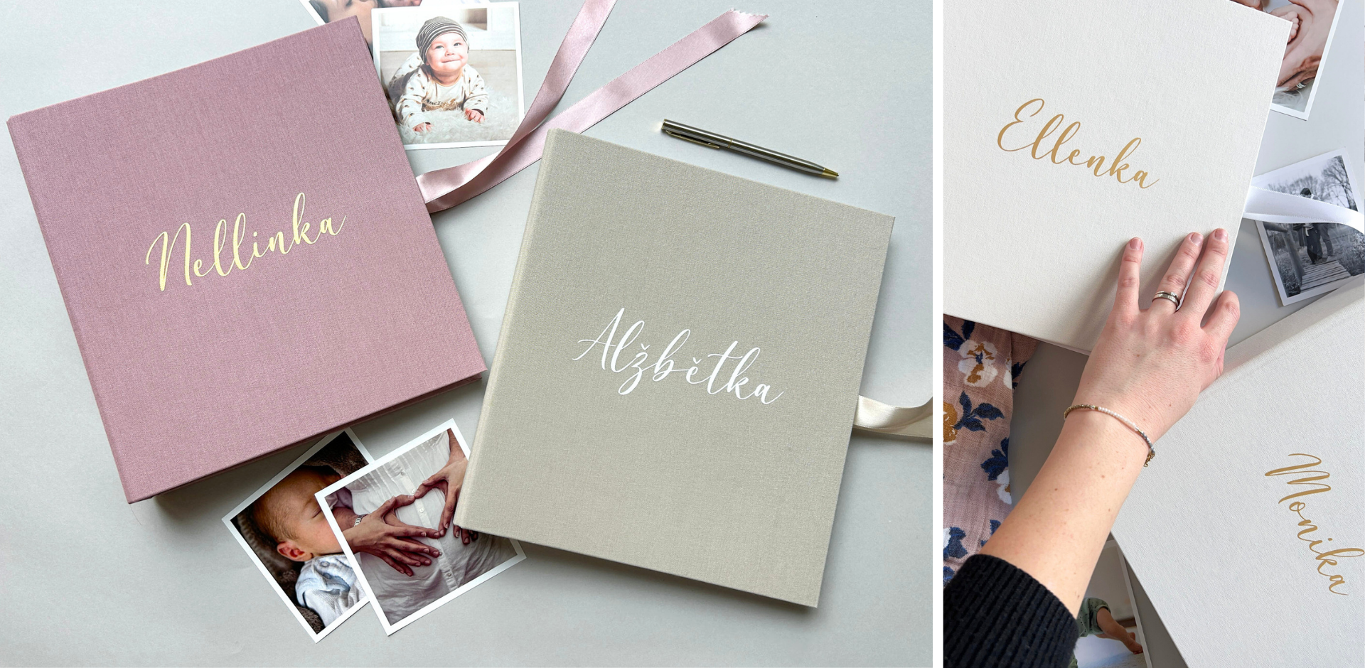 Album pro miminko je k dispozici v několika barvách – od něžné pudrově růžové , přes neutrální béžovou až po oblíbenou eukalyptově zelenou. Ke každé barvě alba si můžete zvolit barvu jména, které přijde na desky. Jméno miminka vám na desky natisknu přesně podle vašeho zadání. Na přání je možné album potisknout i jakoukoliv grafikou, obrázkem nebo vámi vybraným písmem.